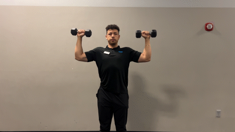 How to do it: Stand with your feet shoulder-width apart and hold a dumbbell in each hand at shoulder height. Your spine should be straight and your core engaged. Keeping your elbows pointed towards the front of your body, press the dumbbells upward, extending your arms fully above your head. Keep your wrists straight during this movement and avoid locking your elbows. Keep your knees slightly bent to avoid arching your back. Slowly lower the dumbbells back down to your starting position, moving your elbows directly downward rather than flaring to the side. Repeat this movement for the 8-12 reps.