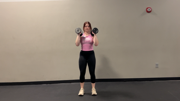 - Hold the dumbbells at shoulder level with your feet shoulder-width apart.